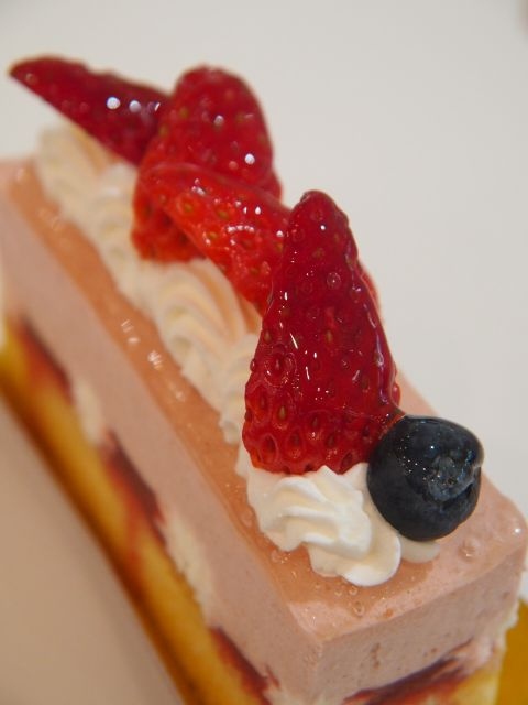 ケーキ生地に自家製の苺ジャムと苺ムースを重ね、更にカットした苺やブルーベリーをトッピングした、苺尽くしのケーキ。