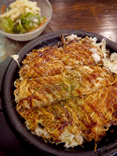 広島風お好み焼きっぽく見えるが、生地が全く見えず、そばがむき出しになっている。そばがカリカリに焼かれていて、自分好みの歯応えになっている。- 旅行時期
