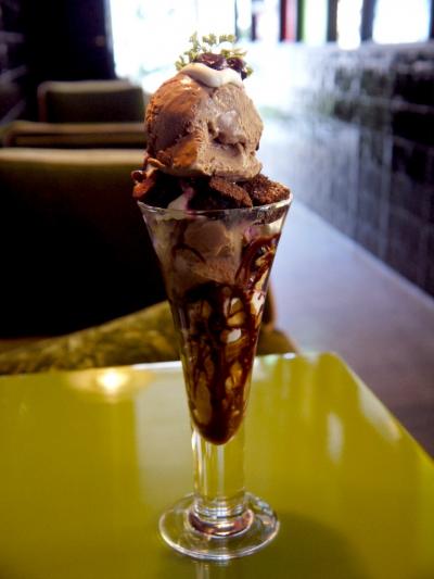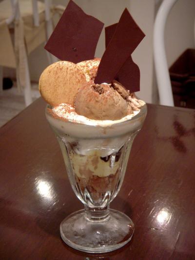 容器に、バニラアイス、チョコレートアイス、コーヒーアイス、生クリームを盛っている。下の部分はガトーショコラ・カスタードクリーム・チョコクリームをこれでもか、と詰め込んでいて、食べ進むのと同時にメインが変わっていく感じ。最初から最後まで楽しめ、まさにケーキショップしか提供出来ないパフェに仕上がっている。- 旅行時期
