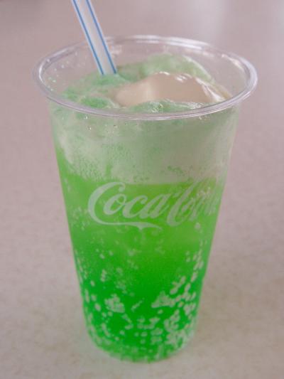 メロンソーダに、アイスクリーム(実際にはラクトアイスと思われる)を、1スクープ分放り込んだもの。