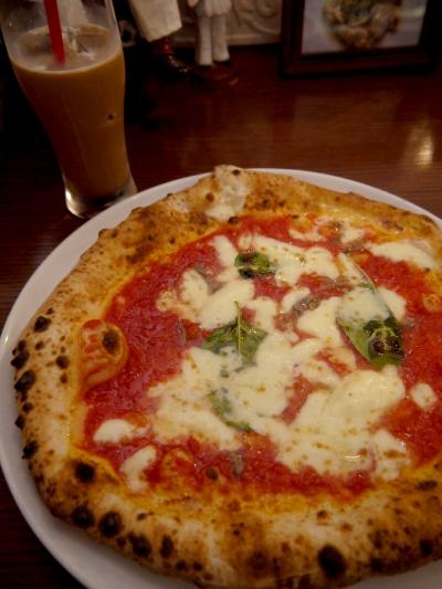 ナイフとフォークが提供されるので、自ら切り分けながらいただく(ナポリではピッツァはこうして食べるのが普通らしい。手で食べようとしても、焼き立てなので持てない)。