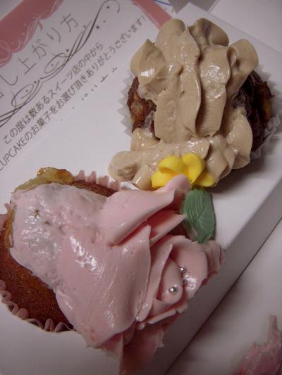 カップケーキの上のクリームらしきものがやけにうず高く盛られている上、やけに凝ったデザインだったので、しっかりしたものだろうなと思い、2種類買って、家に持ち帰った。