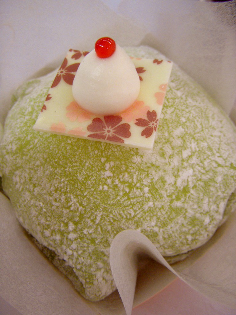 内容的には、抹茶のロールケーキに苺入りのエンゼルクリームを乗せ、全体をもっちりした求肥で覆っている。