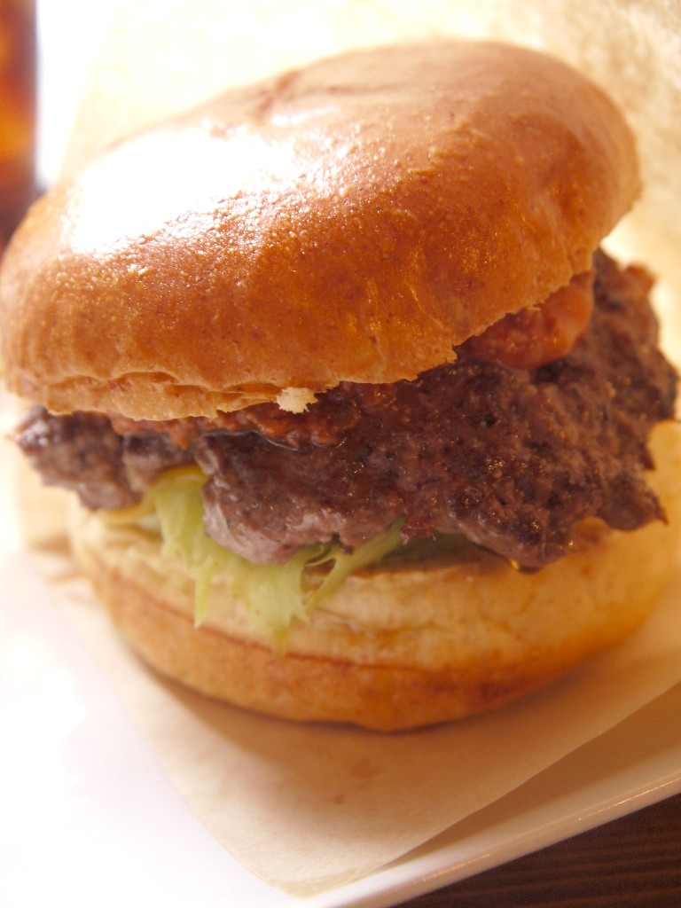 パティは、いかにも手ごねで作られたもので、あえて綺麗に成型しない事で、まるでステーキ肉を挟んでいるかの様に仕上げている。ジューシーで、食べ応えがあり、いかにも肉を食べている、と実感させる。