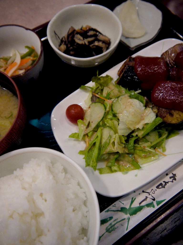 この日は、茄子のはさみ揚げ、ひじきの煮物、野菜の南蛮漬け、納豆、漬物から成っていた。通常は750円だが、アフターコーヒー付だと950円になる。