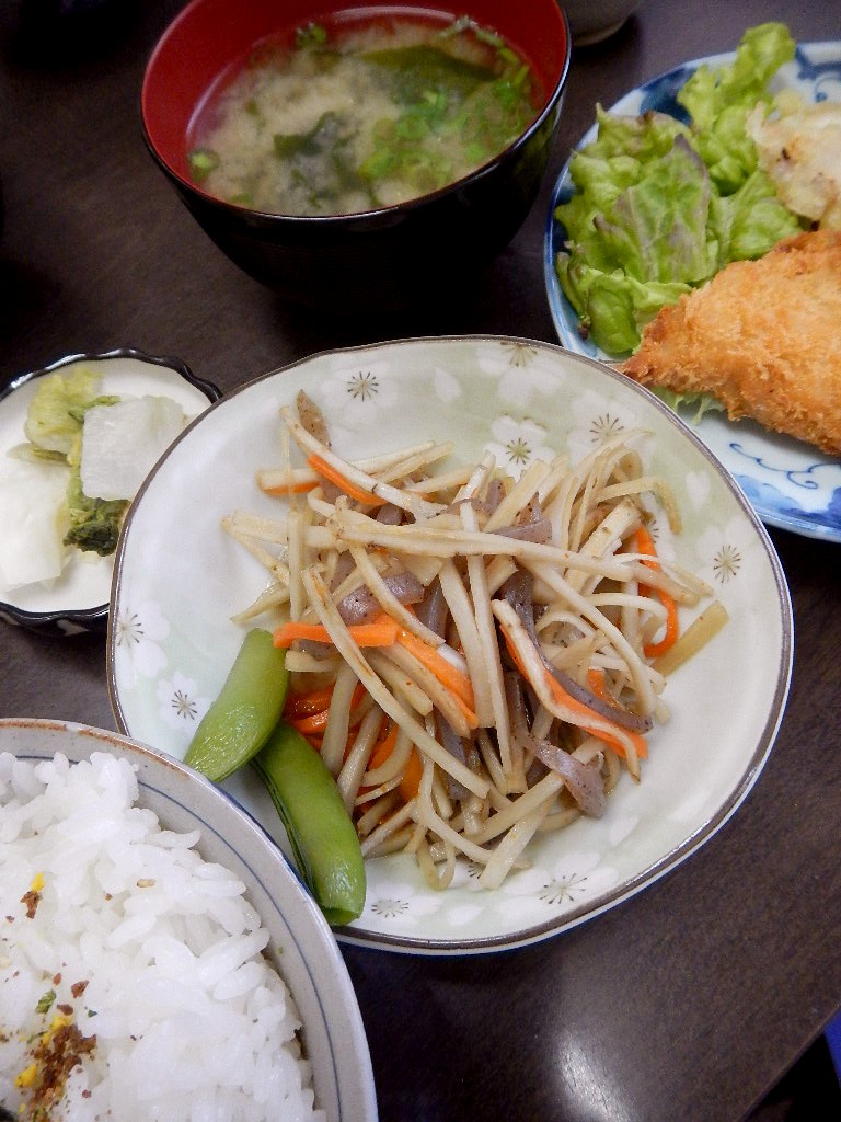 今回、揚げ物セット(魚フライ、芋の天ぷら等)と、ゴボウの和え物をおかずとして選んだ。揚げ物だけでも良かったが、野菜に乏しいので、和え物も選んだ。