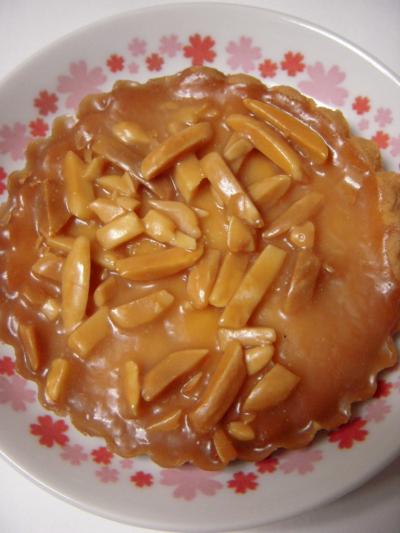 フロランタンというと、大抵はクッキー生地にスライスアーモンドとキャラメルを重ねて焼き上げたものを四角にカットしたものだが、当店のは円形にカットされている。全く別のお菓子の様である。