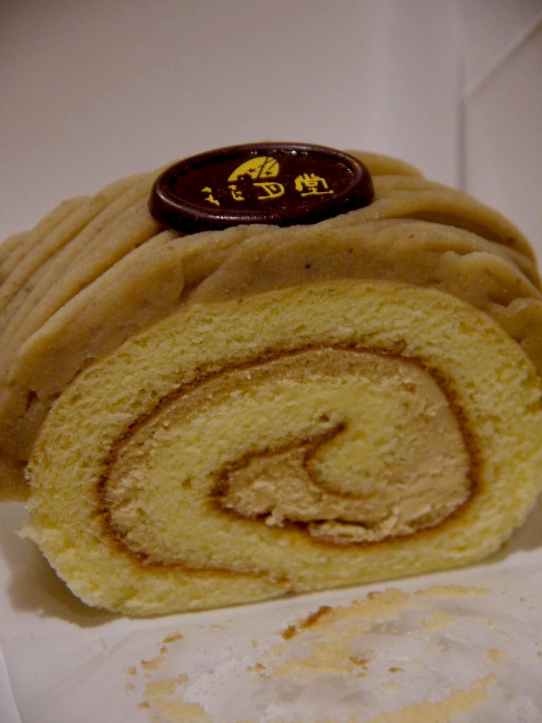 キャラメルクリーム(パッと見にはマロンか、モカクリームに見える)のロールケーキを、マロンクリームで覆っている- 旅行時期