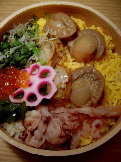 内容的には味付けご飯の上に金糸玉子を敷き占め、ホタテ、タコ、ワカメ、イクラ、レンコン等の具を乗せたもの。
