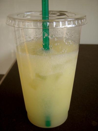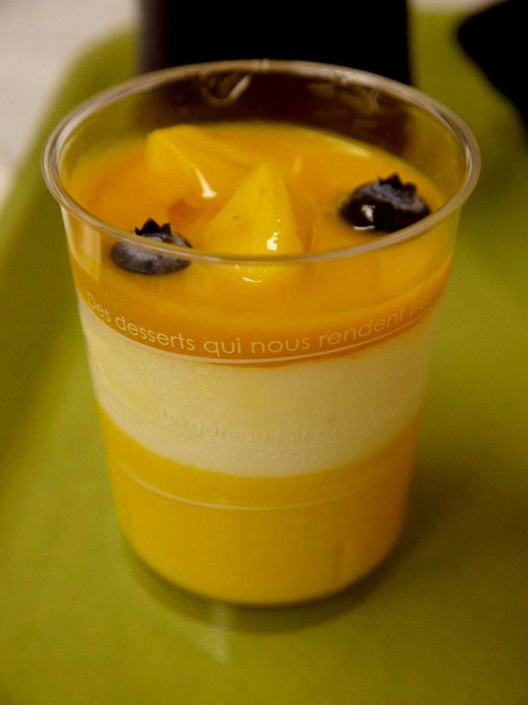 プラスチック容器の中にフルーツ入りのパンプディングがあり、その周りにアングレーズソース(カスタードクリームのソース)を垂らしている。ソースの海にパンプディングの島が浮いている状態。- 旅行時期