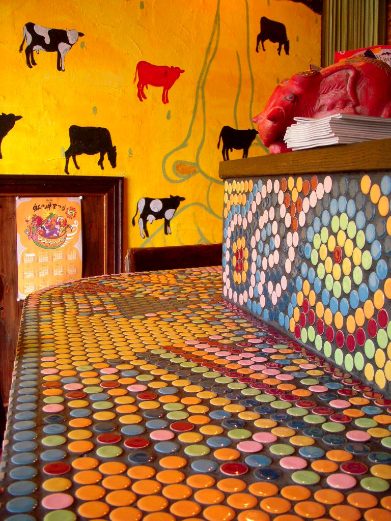 それなりに目立つ店構えだが、それ以上に派手な内装になっている。特に、カウンターは丸いタイルを敷き占めたモザイクで、度肝を抜かれる。日本にいる事を忘れさせてしまう。