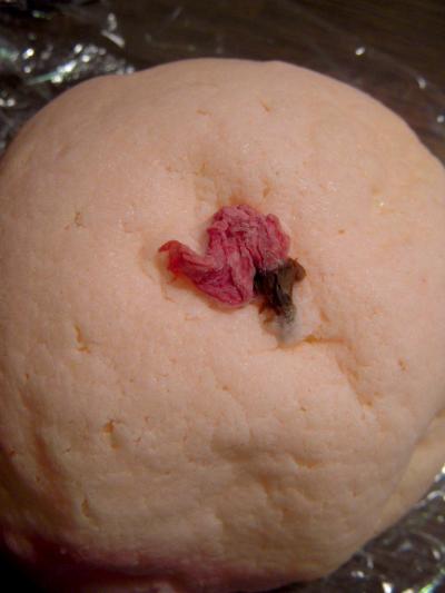 綺麗なピンク色の餡入りのしっとりパンを、ピンク色のクッキー生地で覆っている。