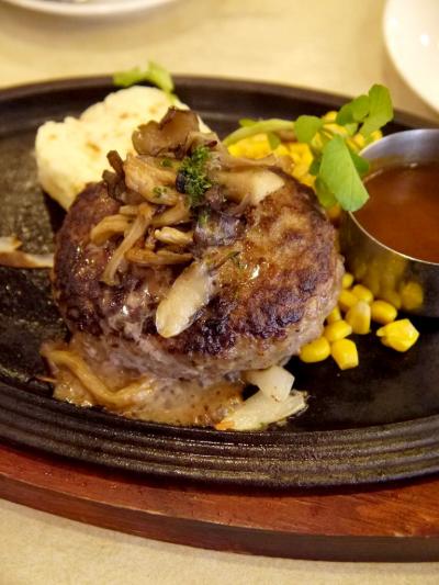 210g国産 黒×黒ハンバーグステーキは、黒毛和牛7.5と黒豚2.5の挽肉のハンバーグをメインとしている。大きく、厚みのあるハンバーグで肉汁たっぷり。日本人好みのハンバーグ。外はカリッと焼かれ、中はふんわり・しっとりしている。- 旅行時期