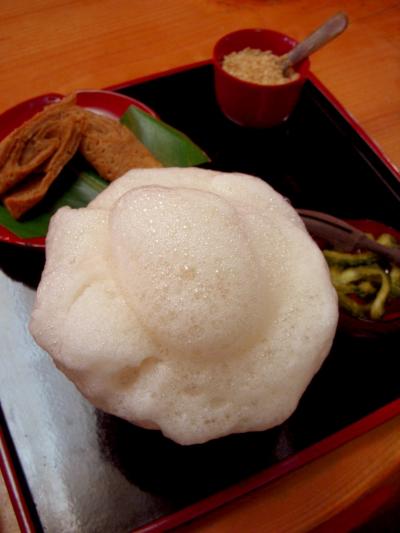 内容的には、お茶に、煎り米を煮出し茶せんで泡立てたものを乗せたもの。大抵の店では、店員が泡立てたものを提供するが、当店では客が泡立ての体験を出来る様になっている(無論、上手く泡立てられなくても、店員が泡立てたものが提供されるので、大丈夫)。- 旅行時期