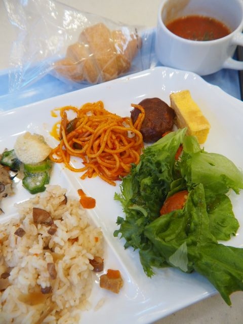 ご飯、サラダ、おかず、パン、ドリンクが提供される。