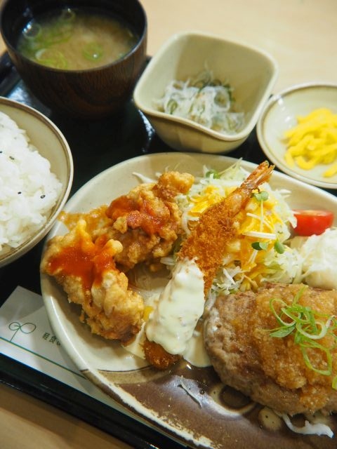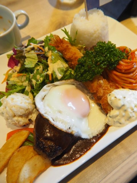 ハンバーグ、エビフライ、ナポリタン、目玉焼き、ライス、サラダ、ポテト、ライスがワンプレートに盛られて提供される。