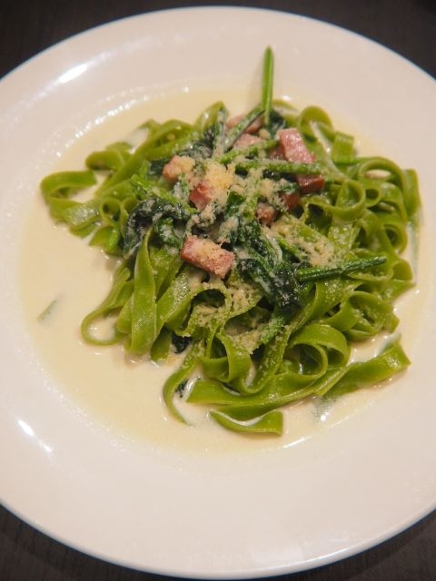 フェットチーネ(ベーコンとほうれん草のクリームソース)は、パスタ料理の1種。