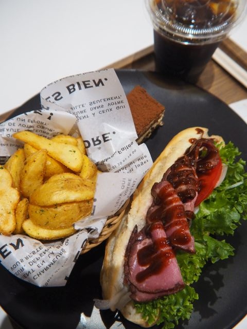 今回のは、ローストビーフ、グリーンリーフ、トマト、オニオンを挟んだバケットパンのサンドウィッチ、フライドポテト、ミニデザート、ドリンクのセット。- 旅行時期
