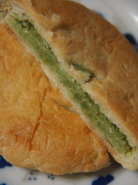しっとりとしたパイ生地に、メロンの風味たっぷりの餡が(緑なので緑茶かずんだに見えるが、メロンの餡)。