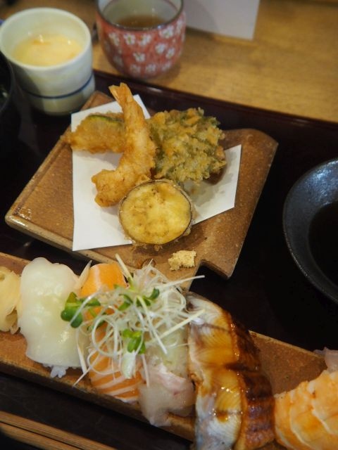 握りすし6貫、天ぷら、茶碗蒸し、汁椀から成る。