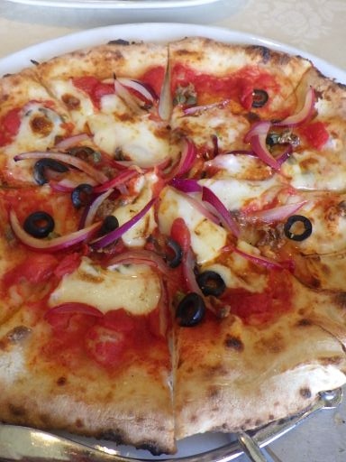 ピッツァにはシチリアーナ(1900円)を選んだ。トマトソース、自家製のモッツァレラチーズ、アンチョビ、ケッパー、ニンニク、赤玉ねぎ、オレガノ、ブラックオリーブのピッツァ。イタリアではどうかは不明だが、ピッツァはアンチョビを使ったものの方が美味しい。- 旅行時期