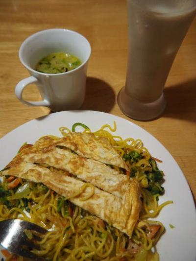 カレー風味の焼きそばに、玉子焼きがトッピングされていた。