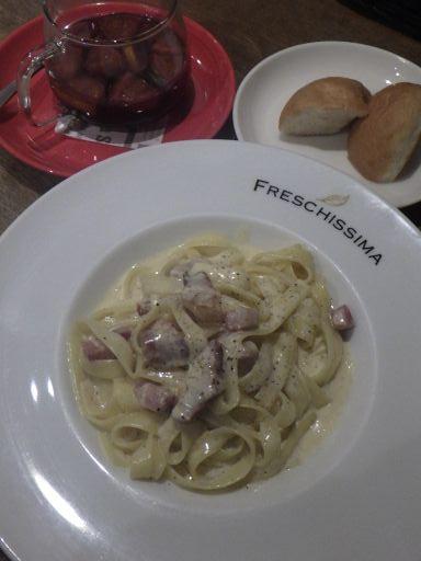 フェトチーネの太く平たい麺は存在感ばっちりで、大振りにカットされたベーコンやソースともよく絡む。