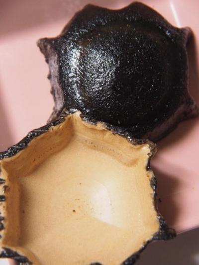 パッと見には真っ黒な塊で、菓子には見えない。裏返すと、南部せんべいの小麦粉の生地が覗くが(裏側には黒胡麻は塗られていない)、それでも漆器と勘違いしそう。勇気を出して齧ってみると「これは菓子なのか」と漸く気付く。
