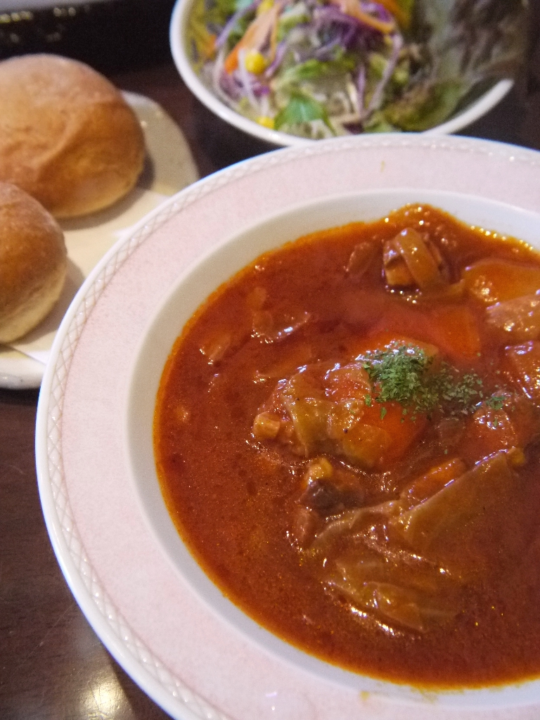 牛肉、キャベツ、じゃがいも、ピーツ等がたっぷり入った、ロシア風のシチュー(本来はウクライナ料理だが)。