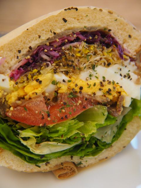 具は、グリーンリーフ、レタス、レッドキャベツ、アルファルファ、トマト、照り焼きポーク、玉子。野菜類は勿論、蛋白質もしっかりと摂れる、ボリューム感溢れるサンドウィッチになっている。