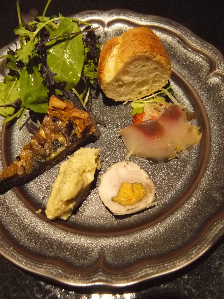 前菜は、鰤、キノコキッシュ、牡蠣、ポーク、ポテトサラダ、パン、グリーンサラダが少しずつ提供される。いずれも彩が良く、丁寧に調理されていた。