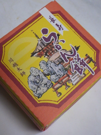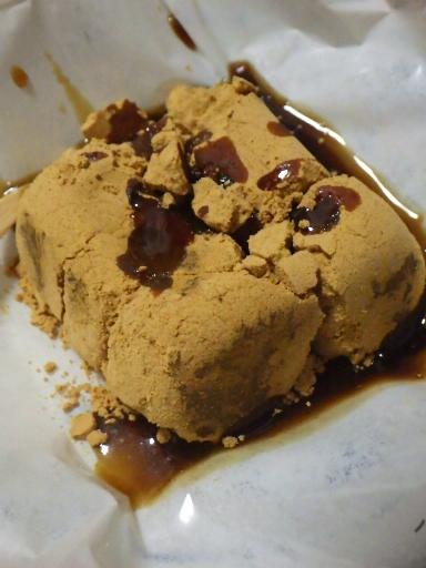 やけにカラフルな絵柄の箱の中に、プラスチック容器に納められた黄な粉餅(求肥)が。黒蜜の小袋が別に用意されているので、餅に掛けていただく。- 旅行時期