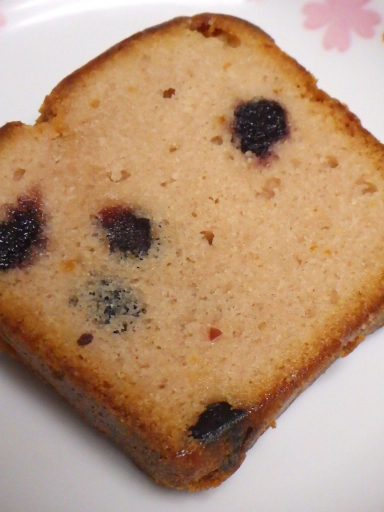 ドライブルーベリーとドライクランベリーを生地に含んだ、しっとりとした、生地の詰まったパウンドケーキ。