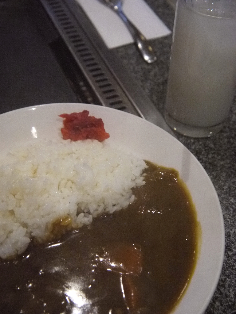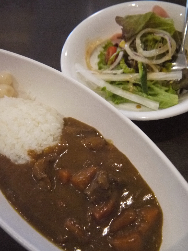 カレールーは、角切りの野菜や、牛肉をたっぷり含んでいて、ピリ辛。カレーらしいカレーと言える。