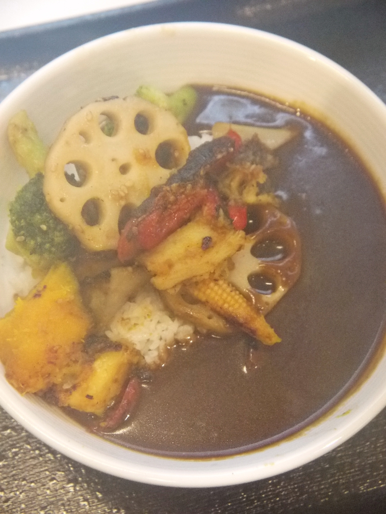 レギュラーメニューの黒カレーに、様々な炙り野菜(蓮根、ブロッコリー、赤ピーマン、ベビーコーン、カボチャ、ジャガイモ)をトッピングしている。実際に推奨量の半分を摂取出来るのかは不明だが、様々な野菜をたっぷり食べられるのは有り難い。- 旅行時期