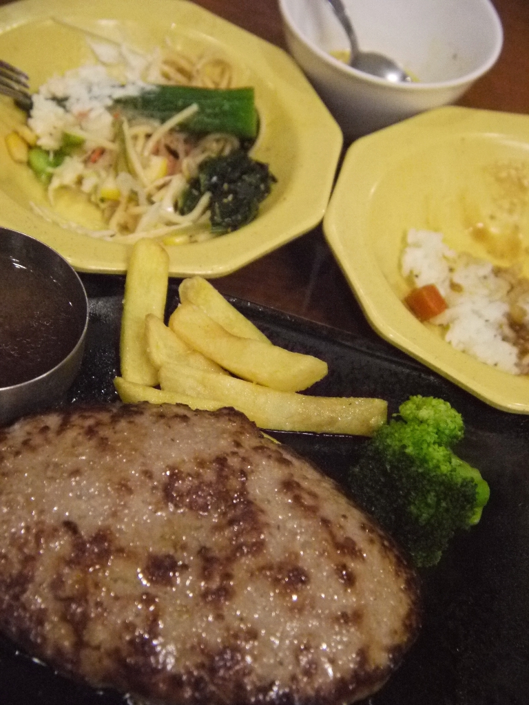 ハンバーグは、オニオンビッツ等も含まれ、ジューシーで、期待を裏切らない美味しさ。ジャンボとあって、ボリュームもあり、食べ応えが。