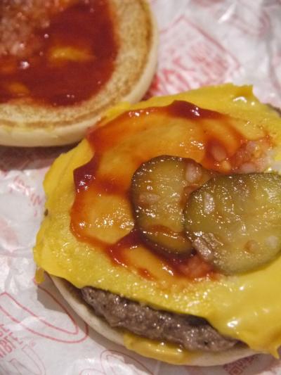 バンズの間に、チーズをトッピングしたビーフパティを2枚重ね、オニオン、ピクルス、ケチャップを挟んでいる。