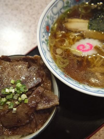 米沢ラーメンは、醤油ベースのスープで、色は濃い目ながらも透き通っていて、醤油の味がガンガン感じられた。ハーフサイズで、牛丼のセットだからか、具はチャーシュー、シナチク、海苔、なるとと、シンプルに纏められている。。