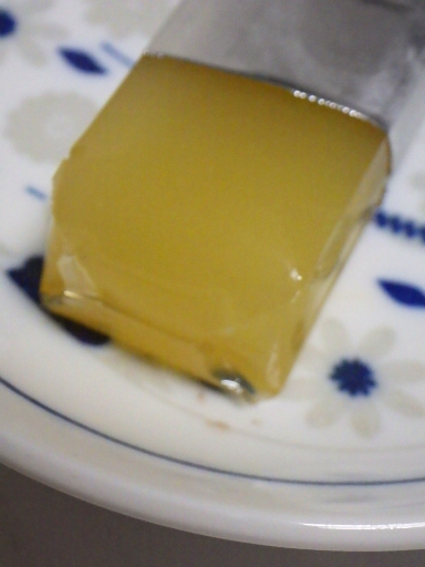 中は柚子風味の白餡だが(柚子風味なのでオレンジ色に染まっている)、非常に滑らかで、クリームの様。口の中で解けて完全に無くなる感じ。