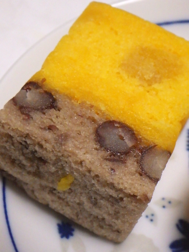 カステラはしっとりとしていて、甘め。それにカボチャ餡(甘さは控え気味だが)が加わるので、全体的にも甘い。