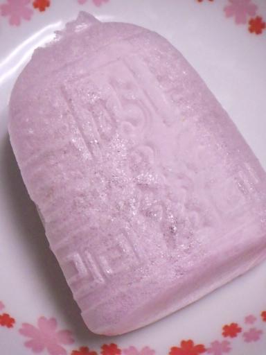 ピンク色に染められた最中の皮は、釣鐘の形状になっている。