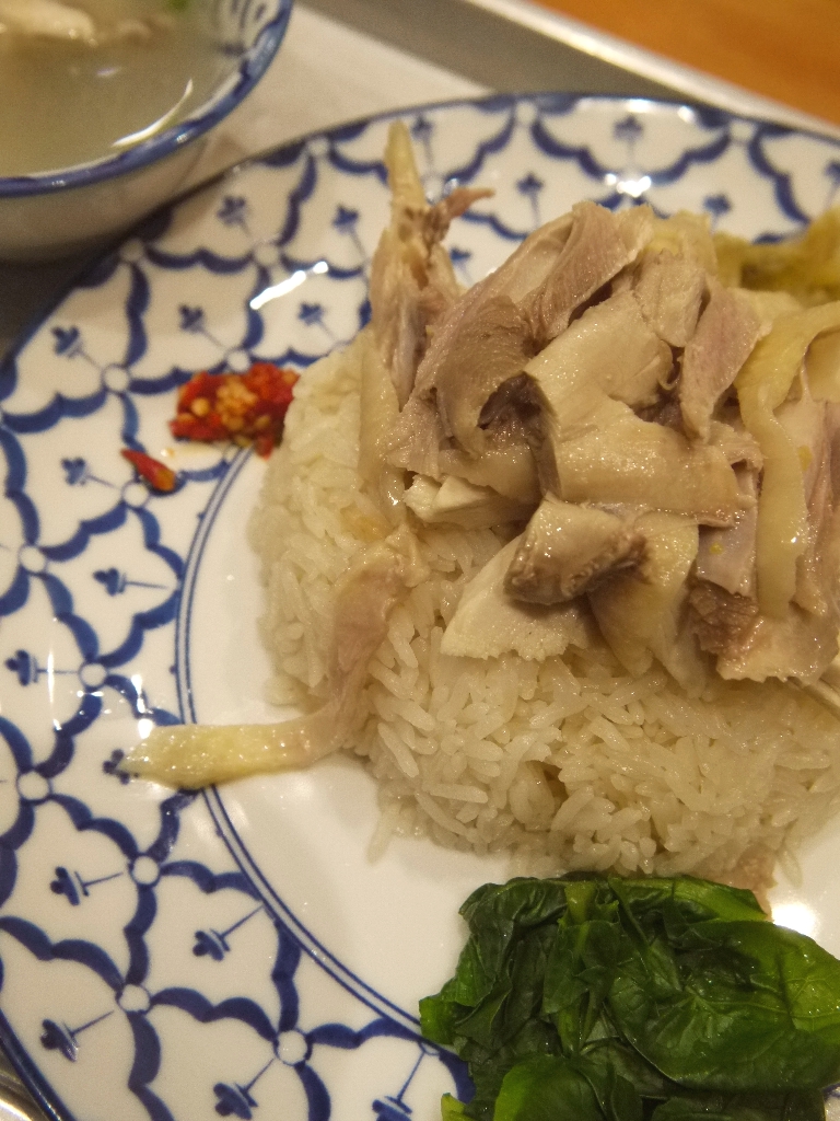 鶏がら等で炊いたスープで鶏を茹で、更にそのスープでジャスミンライスを炊き、皿に盛る。そのライスの上に、茹でた鶏をトッピングしている。海南鶏飯に似た料理(海南鶏飯のタイ版なのかも)。