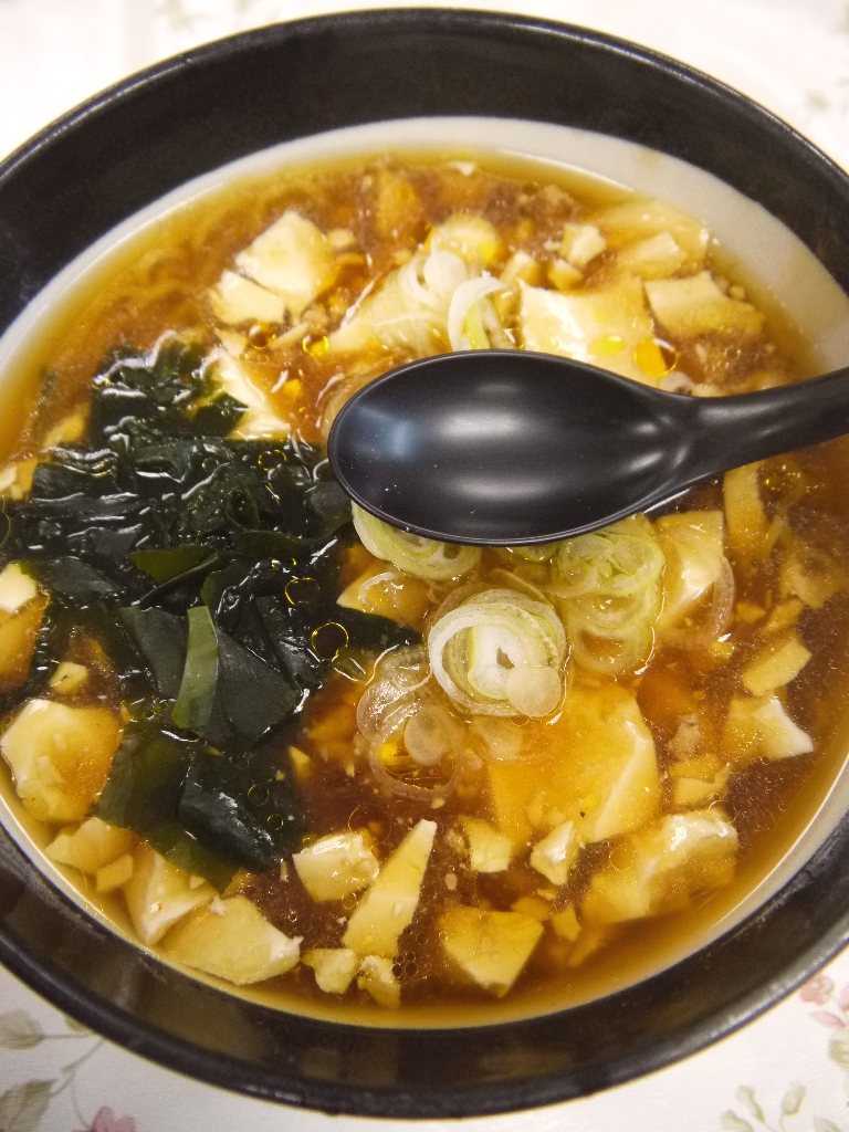 内容的には、醤油ラーメンに、挽肉と豆腐の餡を掛けたもの。パッと見には、麻婆豆腐に見えるが、辛さは全く無い(辛い餡が掛かってしまうと、トーフラーメンとはならないらしい)。したがって、子供でも食べられる。醤油ラーメンがベースなのは、関東だからか。