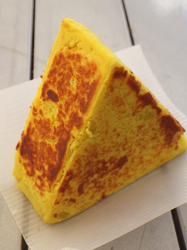 サツマイモを磨り潰し、漉したものを、三角にカットして焼き上げている。