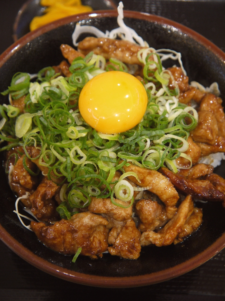 丼にライスを盛り、千切りキャベツを乗せ、その上にとんテキをたっぷり乗せ、更にネギと玉子の黄身をトッピング。