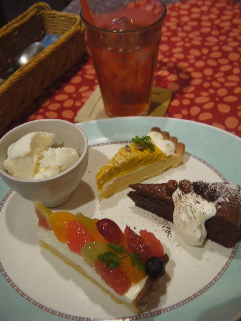 今回、お勧めケーキはフルーツのレアチーズタルトで、かぼちゃとカスタードのタルトとチョコレートケーキを選び、日替わりアイスにはフローズンヨーグルトを選び、ドリンクにはアイスティーを選んだ。- 旅行時期