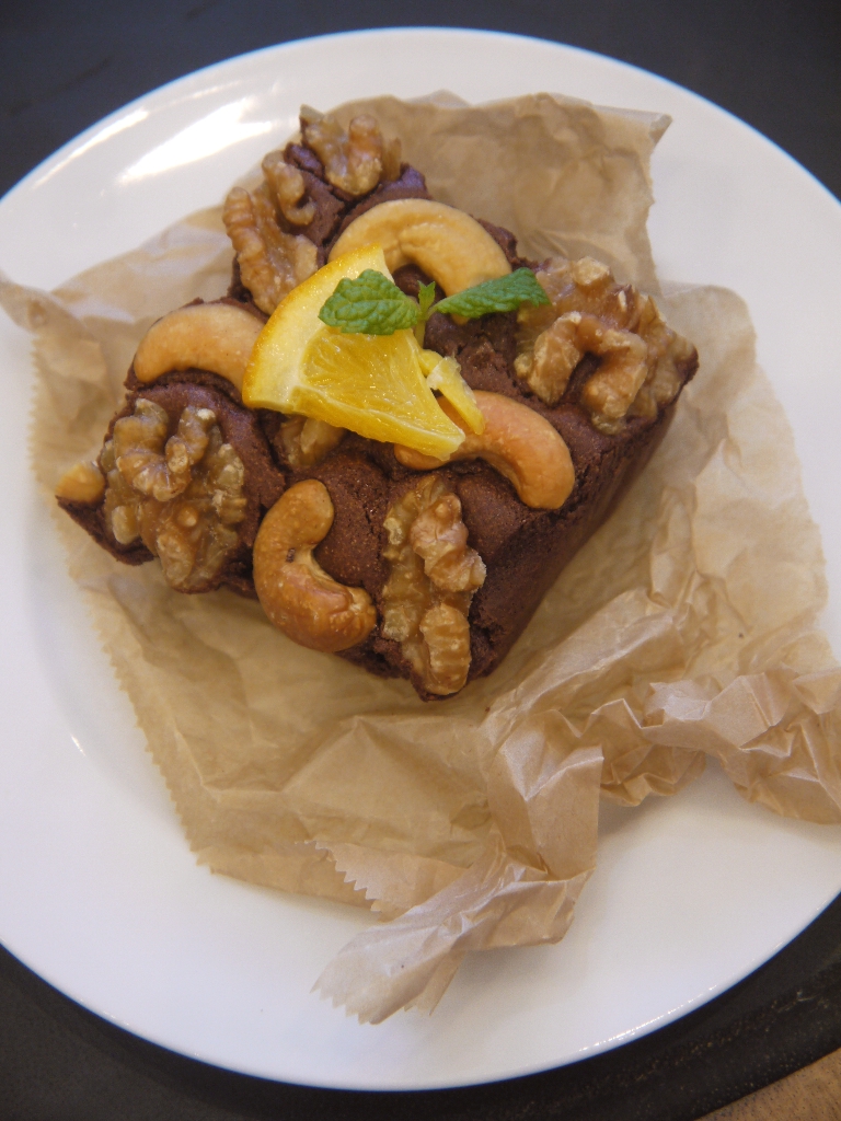 生チョコレートの様な濃厚なガトーショコラに、胡桃やカシューナッツ等のナッツや、オレンジをトッピング。