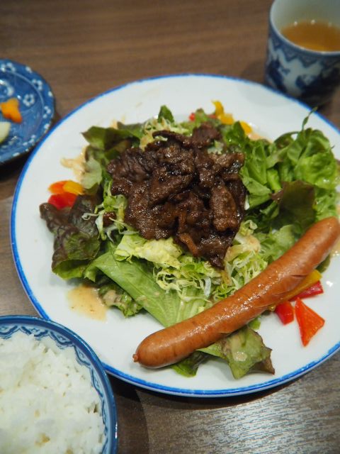 焼肉はしっかりと味付けられ、しっかりと火が通っている。良い部位を使っているらしく、柔らかい肉だった。肉屋さんならではの豪快な定食。- 旅行時期