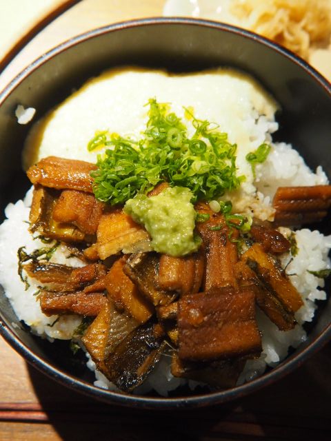 メインの穴子のとろろ飯は、ご飯に穴子ととろろをトッピングしたもの。薬味として、ネギとワサビを添えている。山椒ではなく、ワサビを添えるのは、最近の傾向に沿ったものらしい。