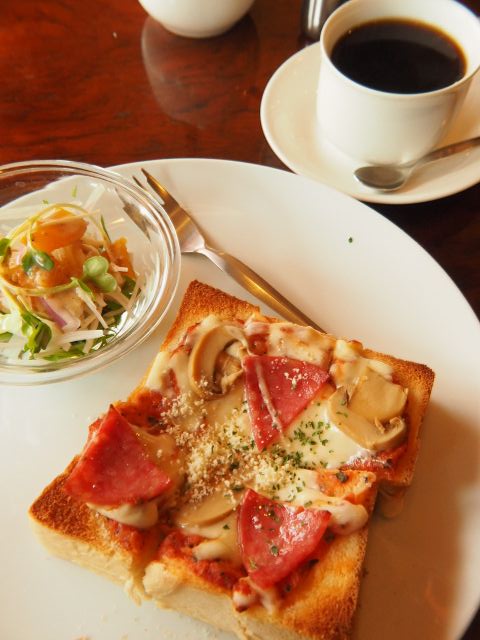 メインのプレートにはピザトーストとサラダが盛られている。- 旅行時期
